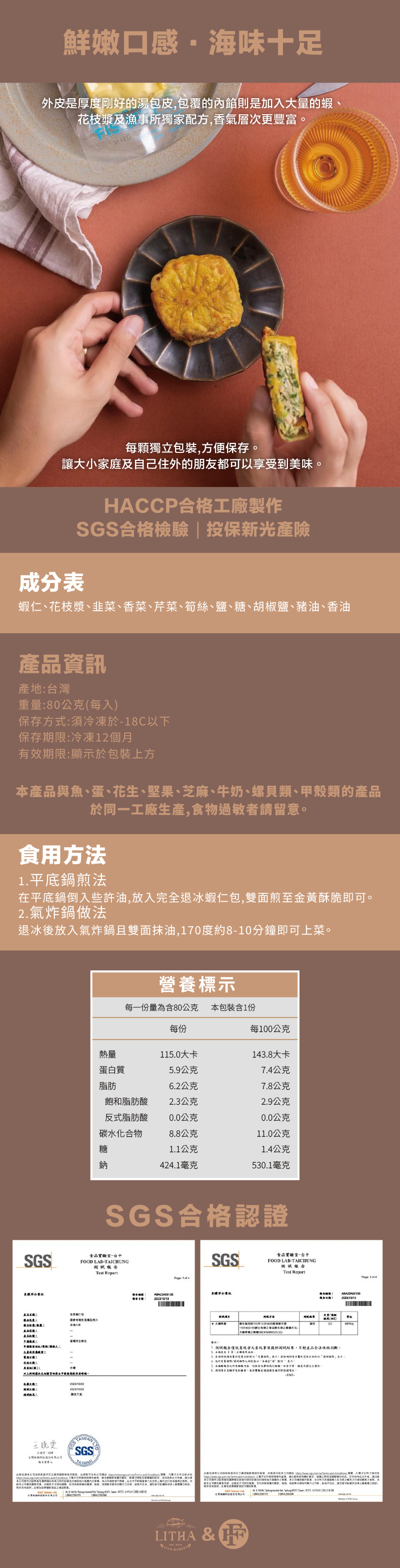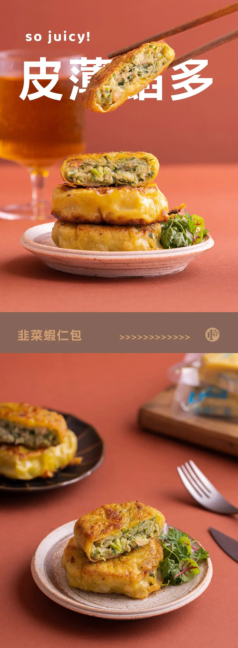 採用新鮮韭菜、蝦仁與花枝漿製作,外皮厚度適中、內餡滿滿料,拆袋即煎、炸即香。每一口都是蝦仁 Q 彈與韭菜香氣交融,堪稱團購熱門、聚會下酒必備!