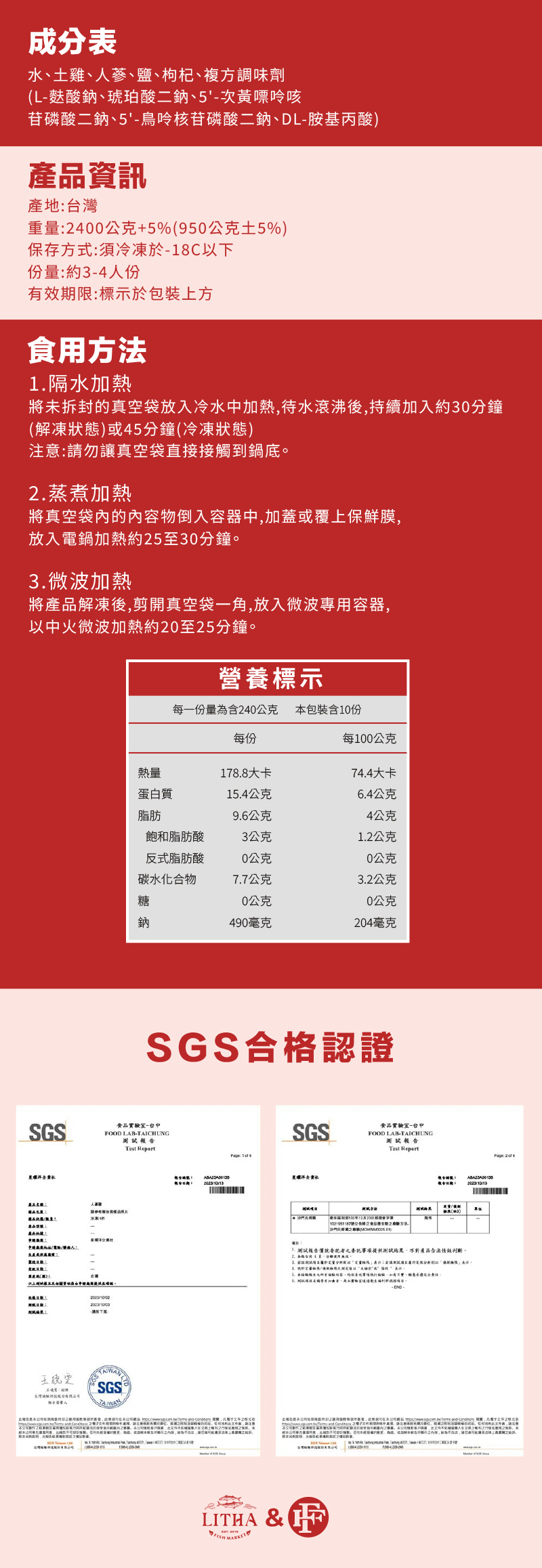 嚴選優質整隻土雞搭配人蔘,經慢火熬煮入味,釋放雞肉與人蔘的雙重精華,湯頭甘醇、肉質嫩滑。適合家宴補養、節慶圍爐、術後調養,方便加熱即可享用