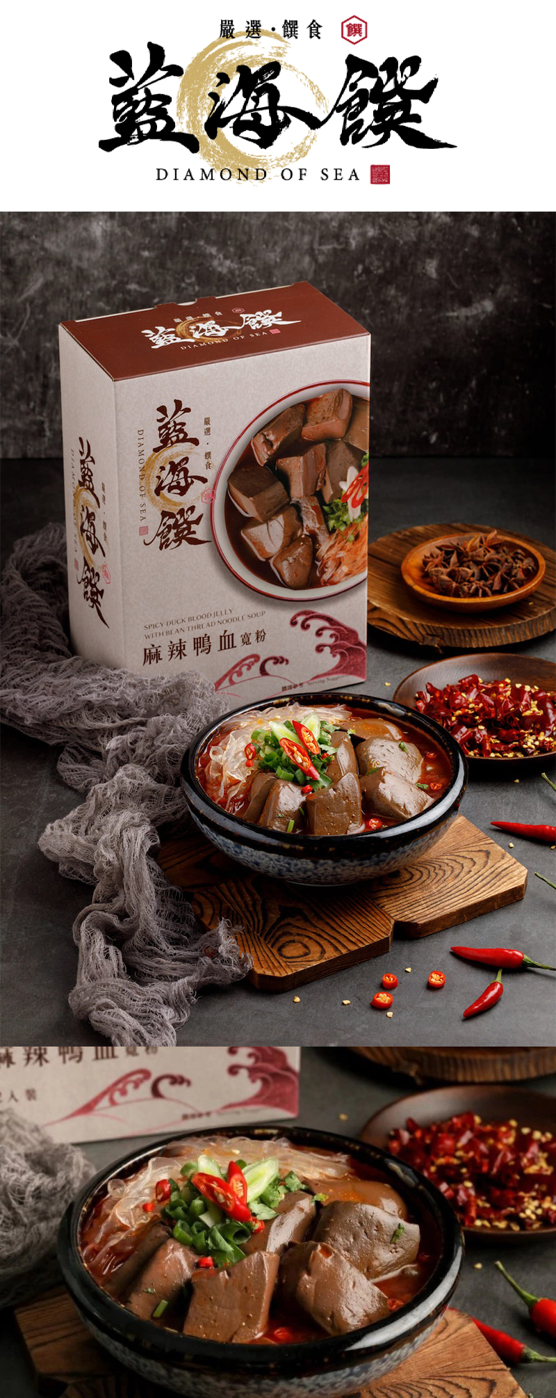 來自藍海饌的經典麻辣湯底料理包,選用軟嫩飽滿鴨血與手工寬粉,加上麻辣湯底與臭豆腐/配料,一盒兩份,適合家庭、好友聚餐或宵夜享用。