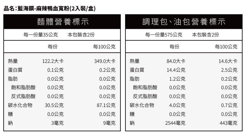 ▸調理包&油包成份:水、雞骨、鴨血【鴨血、水、鹽、焦磷酸鈉、多磷酸鈉、偏磷酸鉀、矽樹脂、脂肪酸山梨醇酐酯、聚山梨醇酐脂肪酸酯、羧甲基纖維素鈉】、麻辣醬【沙拉油、芝麻香油(大豆油、芝麻)、辣豆瓣醬(蠶豆、精鹽、辣椒)、酒釀(米、酒麴、水)、紅蔥、蒜、糖、鹽、胡椒、甘草、肉桂、草果、八角、豆蔻、朝天椒、大紅袍、雞心椒】、鹽、L-麩酸鈉。