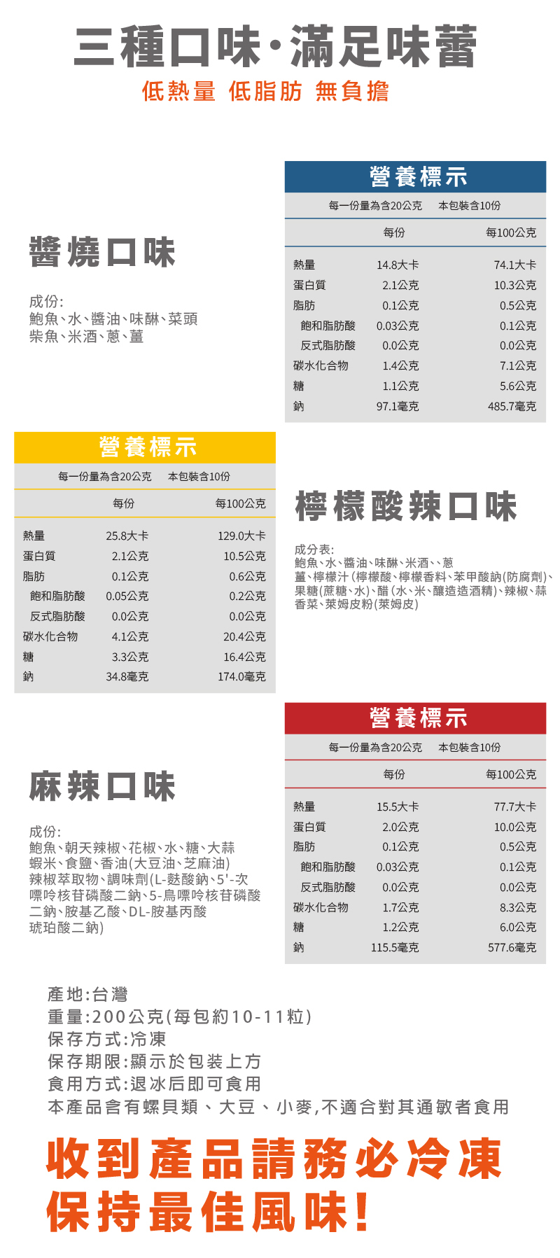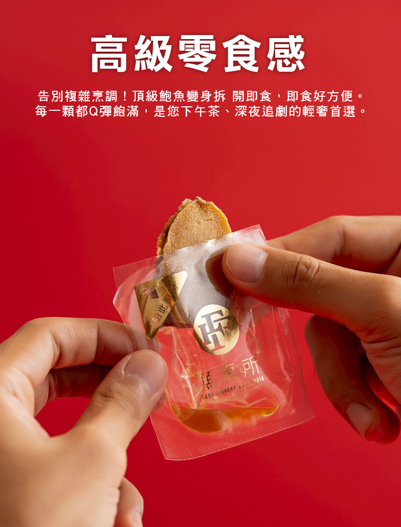 一口大小設計方便食用,香氣濃郁、口感鮮嫩,不論是宴客前菜、下酒菜或年節送禮都體面又美味。解凍即可享用,冷食熱食皆宜,滿滿海味一口入魂。