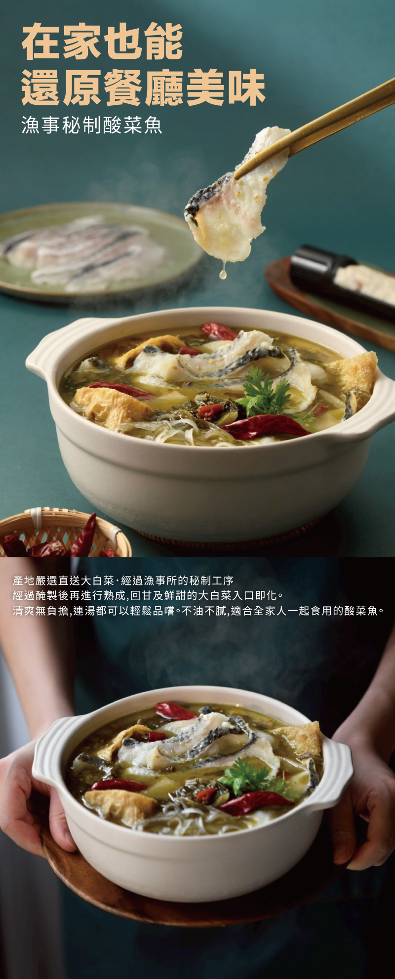 嚴選新鮮魚片搭配手工發酵酸菜,湯頭酸香爽口、肉質鮮嫩多汁,冷凍保存,簡單加熱即可享用。無論是家常快煮、火鍋湯底,或聚餐主菜,都能輕鬆上桌,帶來暖胃與開胃雙重效果。