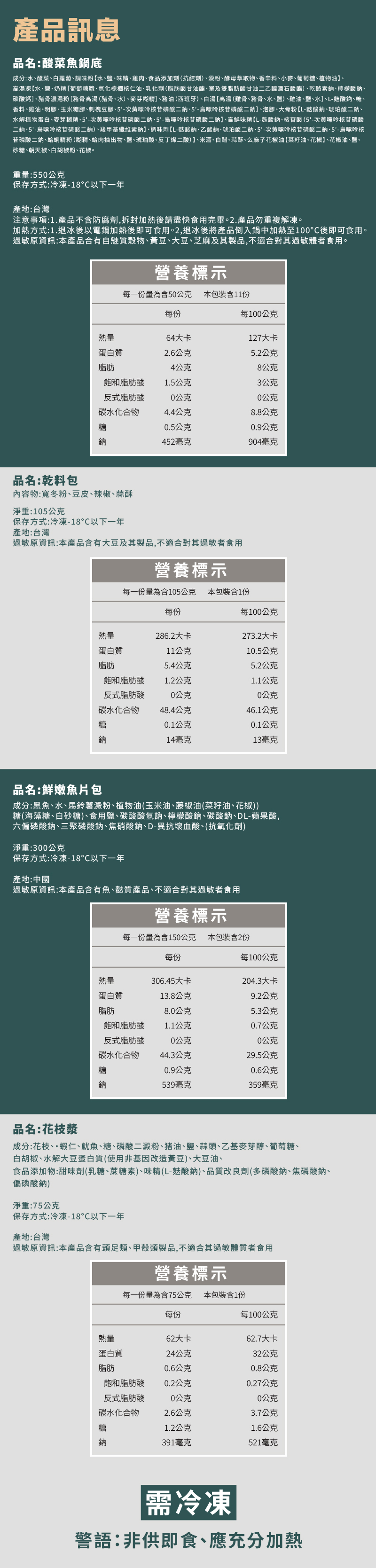 ▸ 成份:魚片、酸菜、調味料(詳如包裝)