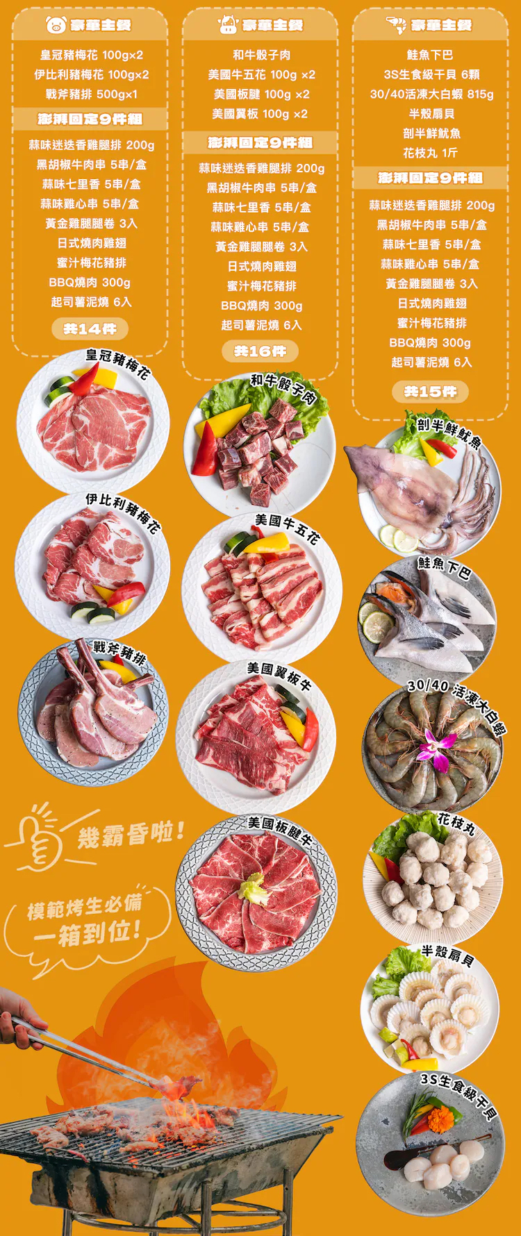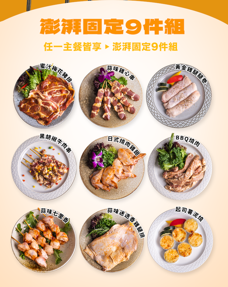 ▸ 蜜汁梅花豬排、黑胡椒牛肉串、蒜味七里香、蒜味雞心串、日式燒肉雞翅、蒜味迷迭香雞腿排、黃金雞腿腿卷3入、BBQ燒肉、起司薯泥燒