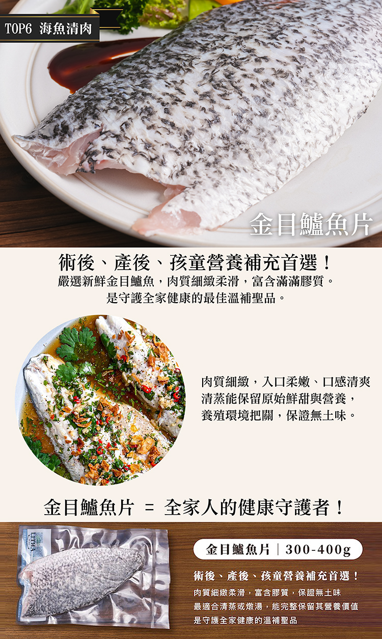 嚴選台灣海水養殖金目鱸魚,經專業處理去除腥味與土味,肉質鮮美細嫩,適合各式料理。