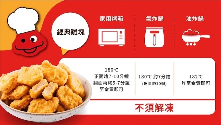 1.將烤箱預熱後,雞塊不需要解凍直接送烤箱,建議加墊烘焙紙於烤盤上。