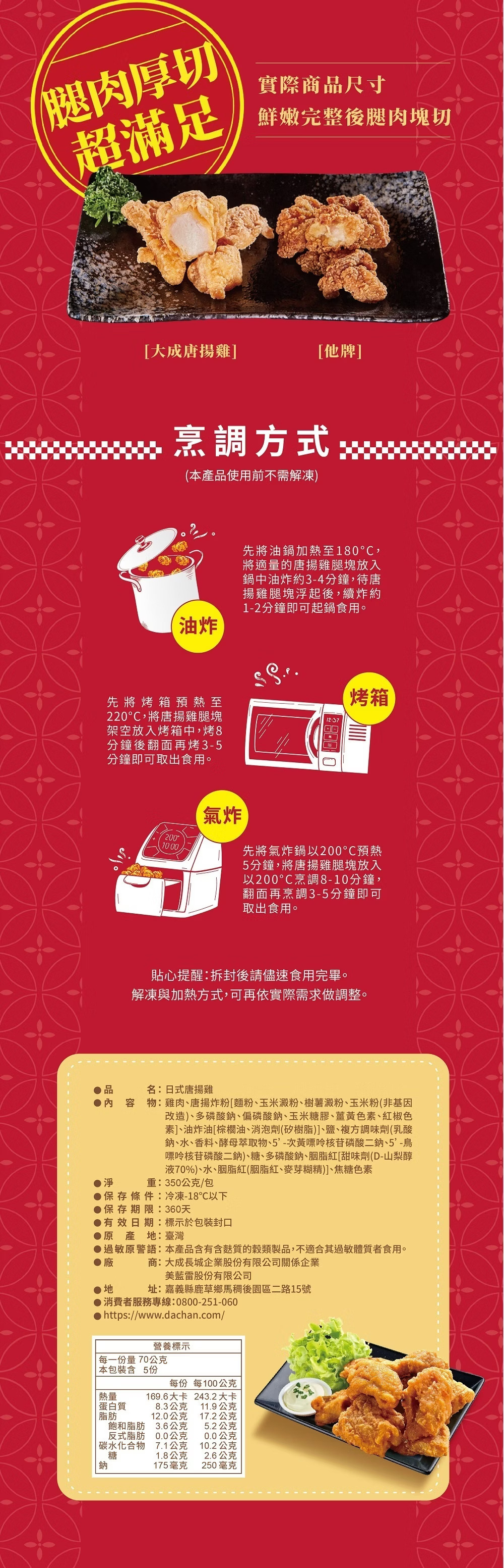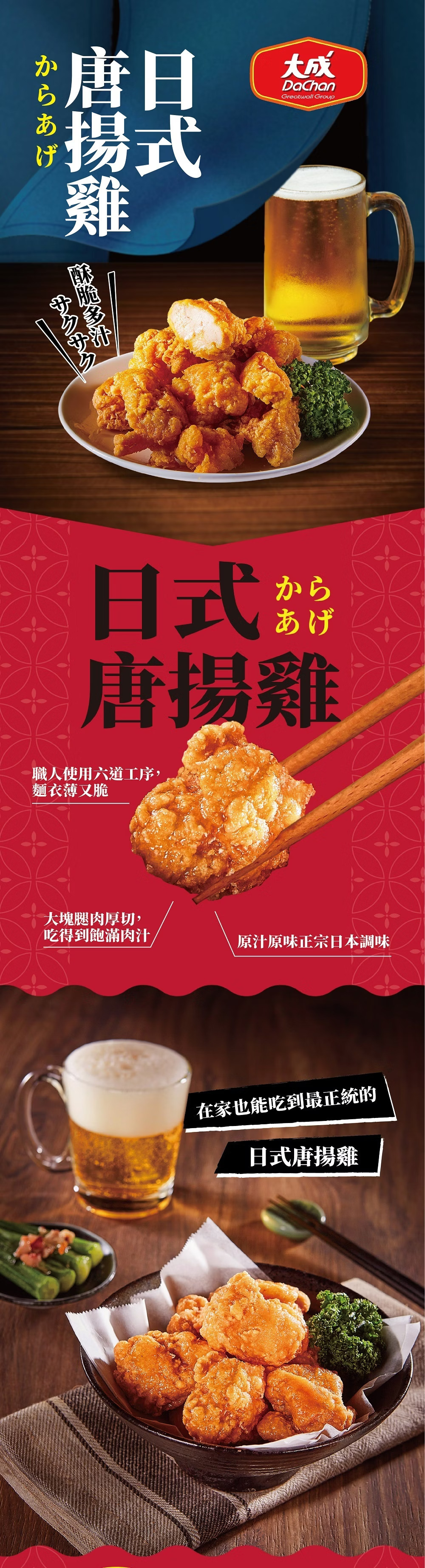 喜歡唐揚雞的你絕對不能錯過!嚴選新鮮雞腿肉厚切製作,職人手工六道工序入味處理,每一口都是酥香外皮、飽滿肉汁。無論油炸、烤箱或氣炸鍋,快速上桌、輕鬆滿足!